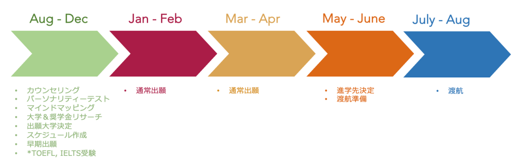 出願する大学・学部を決めた後、新たに別のミーティングを設定し、何をいつまでに準備しなくてはいけないか、エッセイの書き方や面接の指導なども含め、入念にスケジュールを組んでいきます。